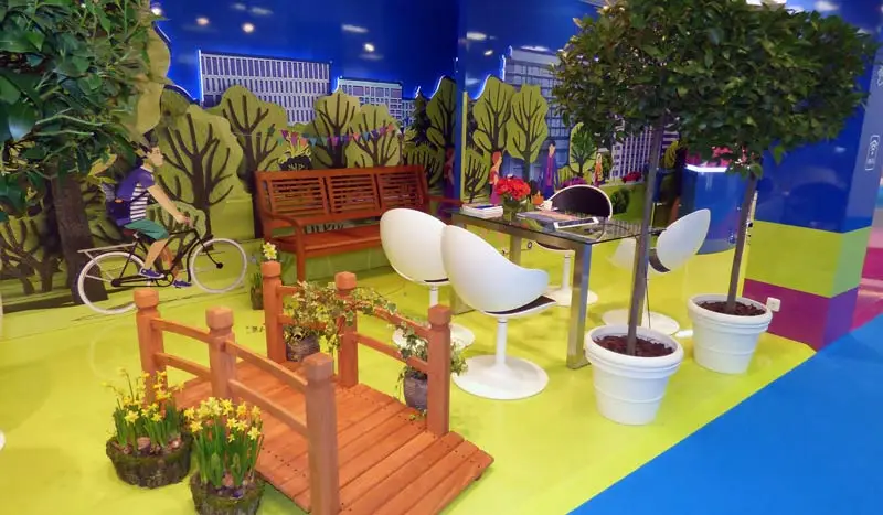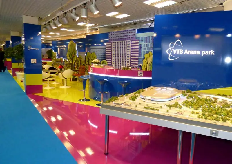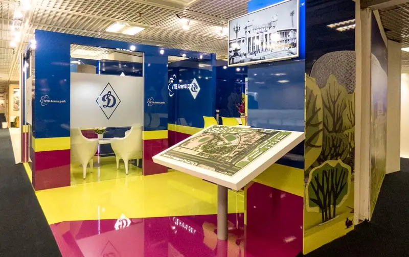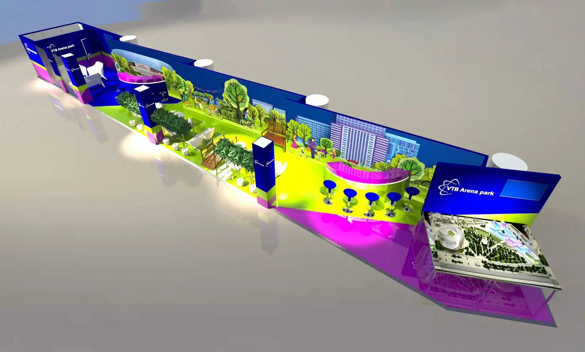 Der Messestand „VTB Arena Park“ auf der MIPIM 2014 in Cannes faszinierte mit seinem einzigartigen Animationsstil. Ziel war es, die Umweltbereiche – Stadion, Wohncluster und Park – kreativ zu präsentieren. Das Konzept ließ animierte Elemente in den 3D-Raum eintauchen: Figuren schienen aus einem Poster herauszutreten, Bäume aus Bildern „lebten auf“ und wurden Teil des Standes. Ein Spielzeugbrücke bildete das zentrale Designmerkmal, das die Brücke zwischen der Märchenwelt der Animation und der realen Welt symbolisierte.